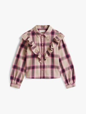 Ce chemisier en flanelle en fil tissé teint joue la carte de la fantaisie grâce à un motif à carreaux classique et des volants chic à l'avant et à l’arrière.