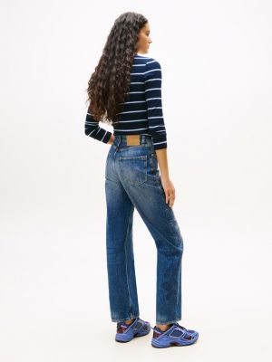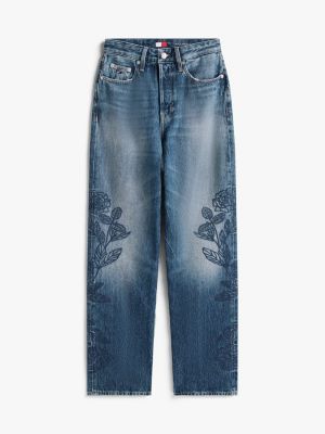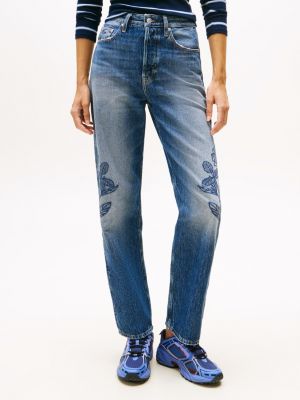 Ce jean en denim western présente une taille haute flatteuse, une jambe droite slim et une jolie broderie florale.