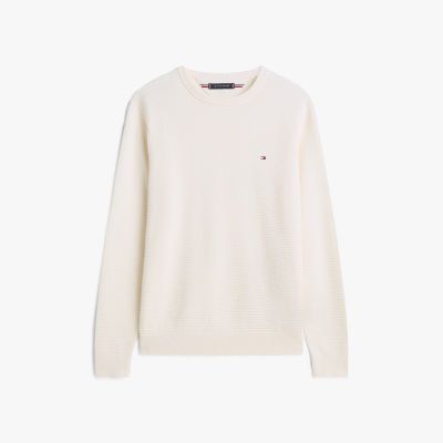 Ce pull se distingue par sa maille texturée. Le col ras-du-cou, les poignets et l'ourlet adoptent une finition côtelée classique.